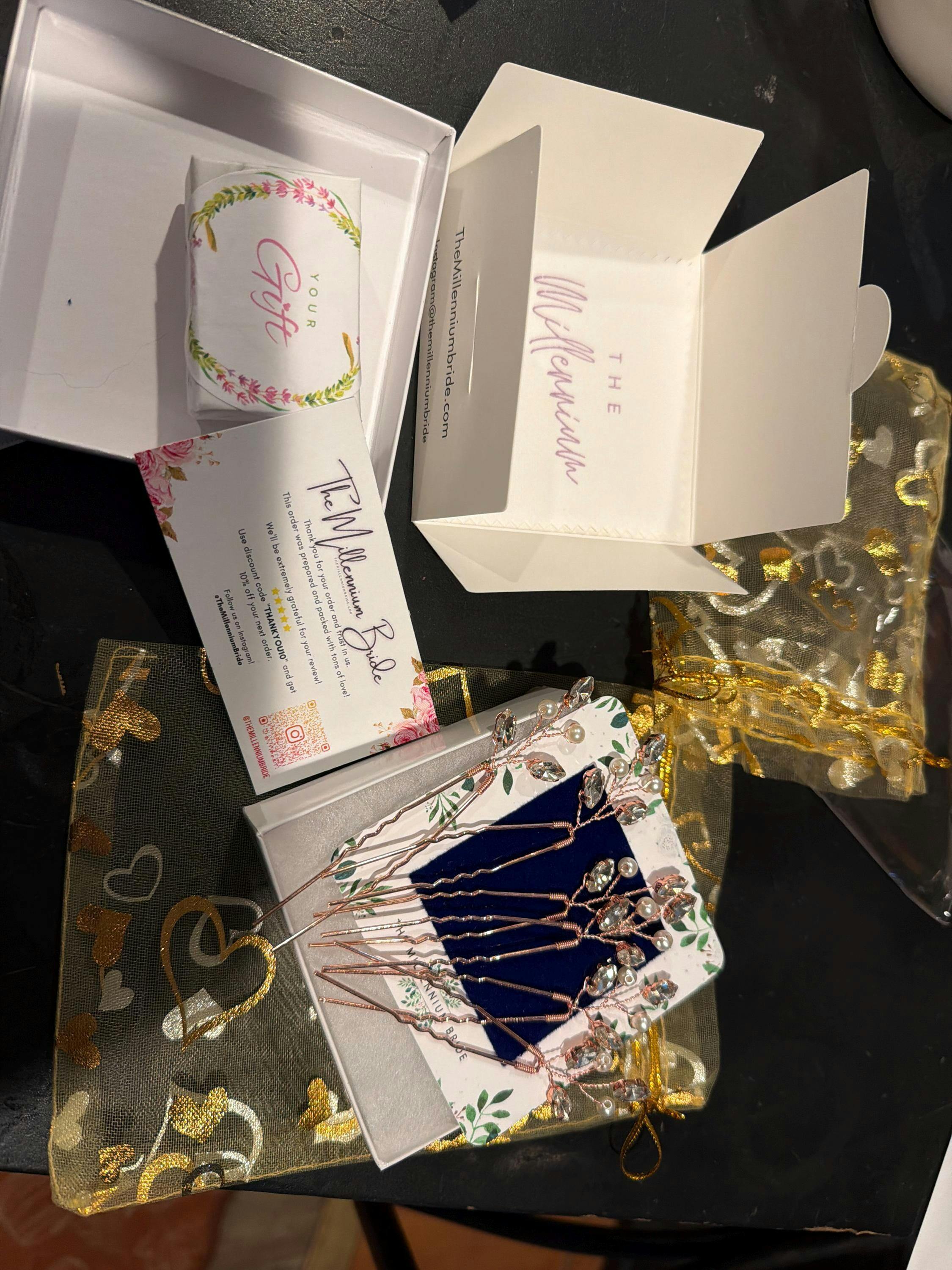 am SO impressed I don't even know where to start. The hair pins themselves are stunning — even more beautiful in person. The crystals and pearls catch the light so delicately and they feel sturdy, not flimsy at all. They're elegant, romantic, and exactly the soft, sparkly bridal look I was hoping for.