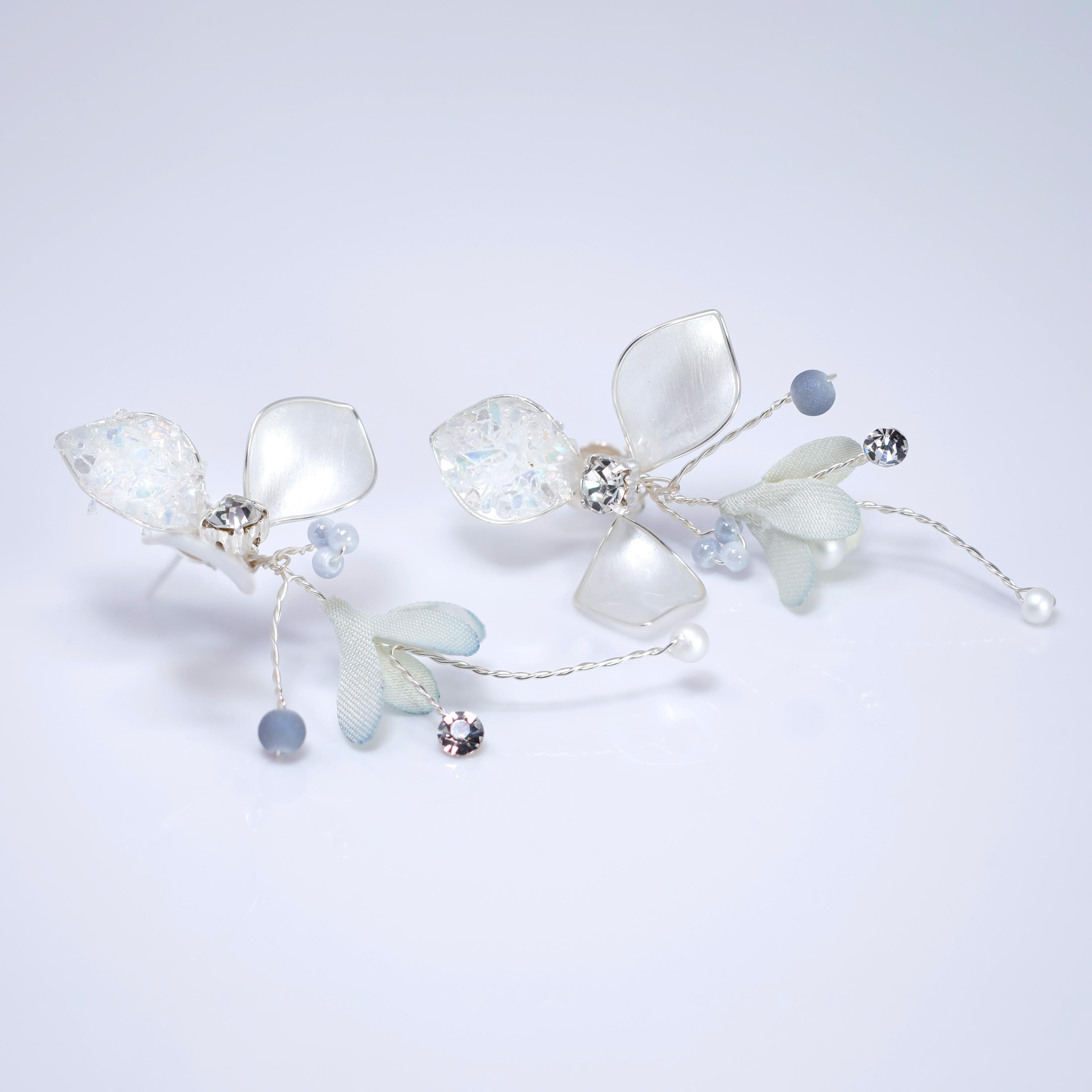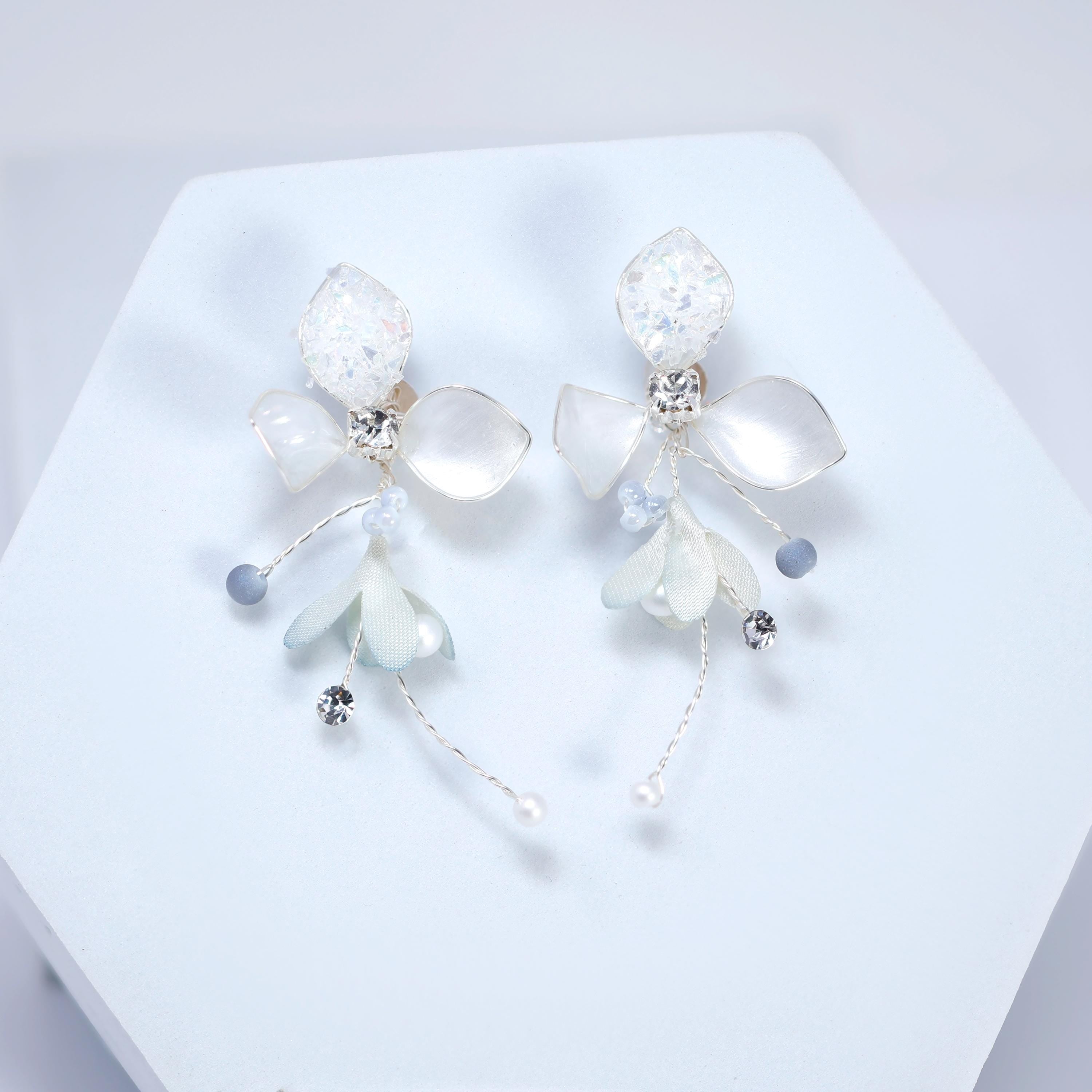 Shimmering Resin Silver Petals And Crystal, Rhinestone Earrings, Long Bridal Jewelry, Clip On Statement Earrings.