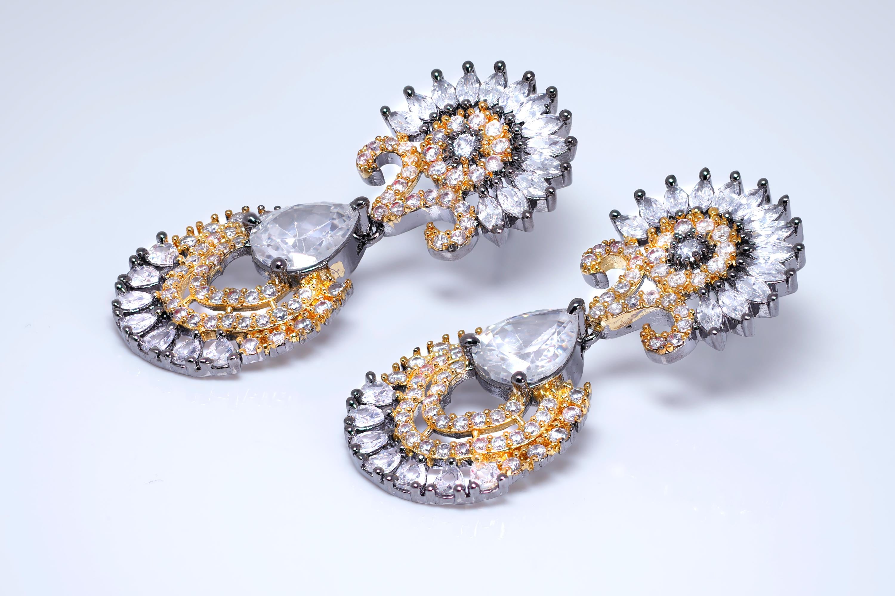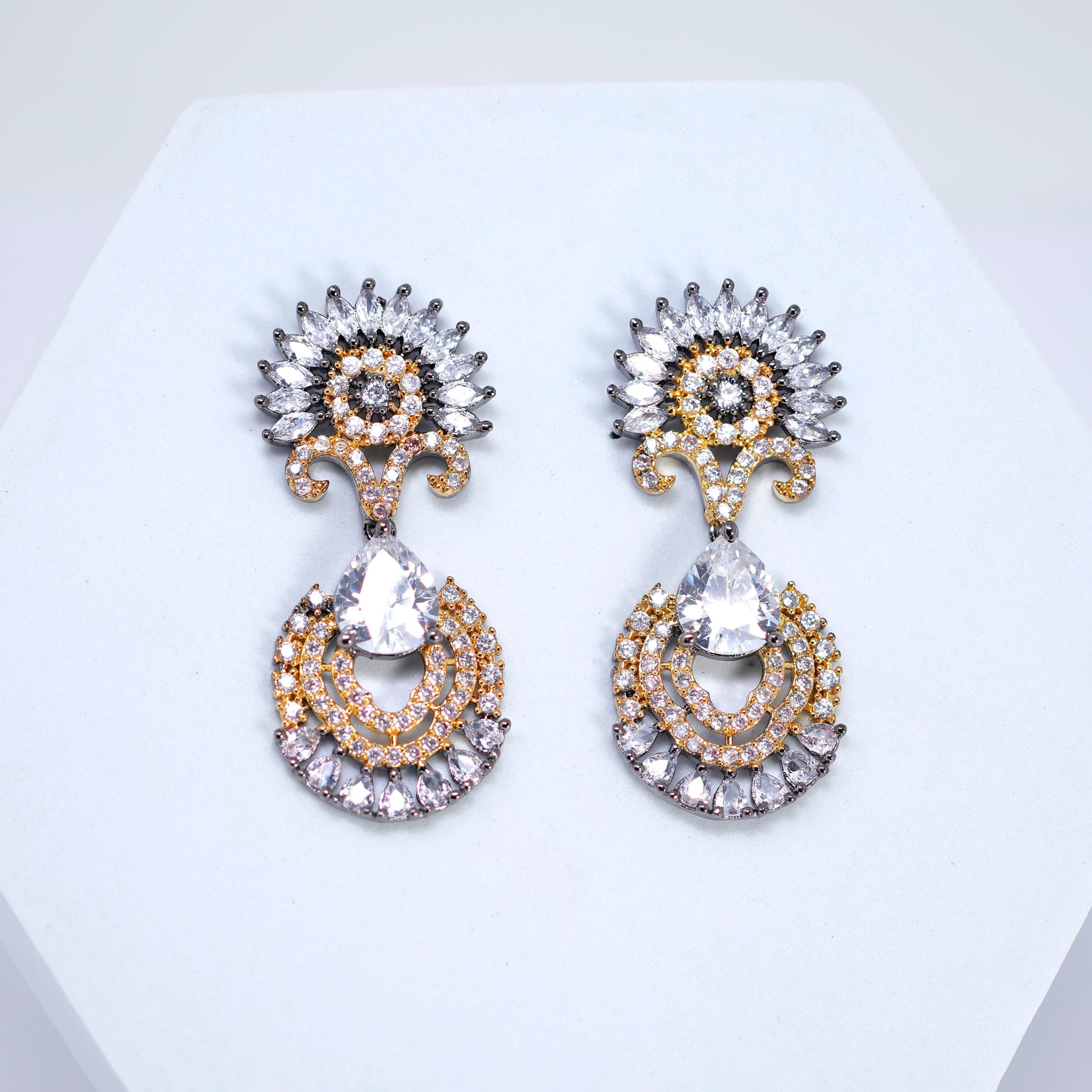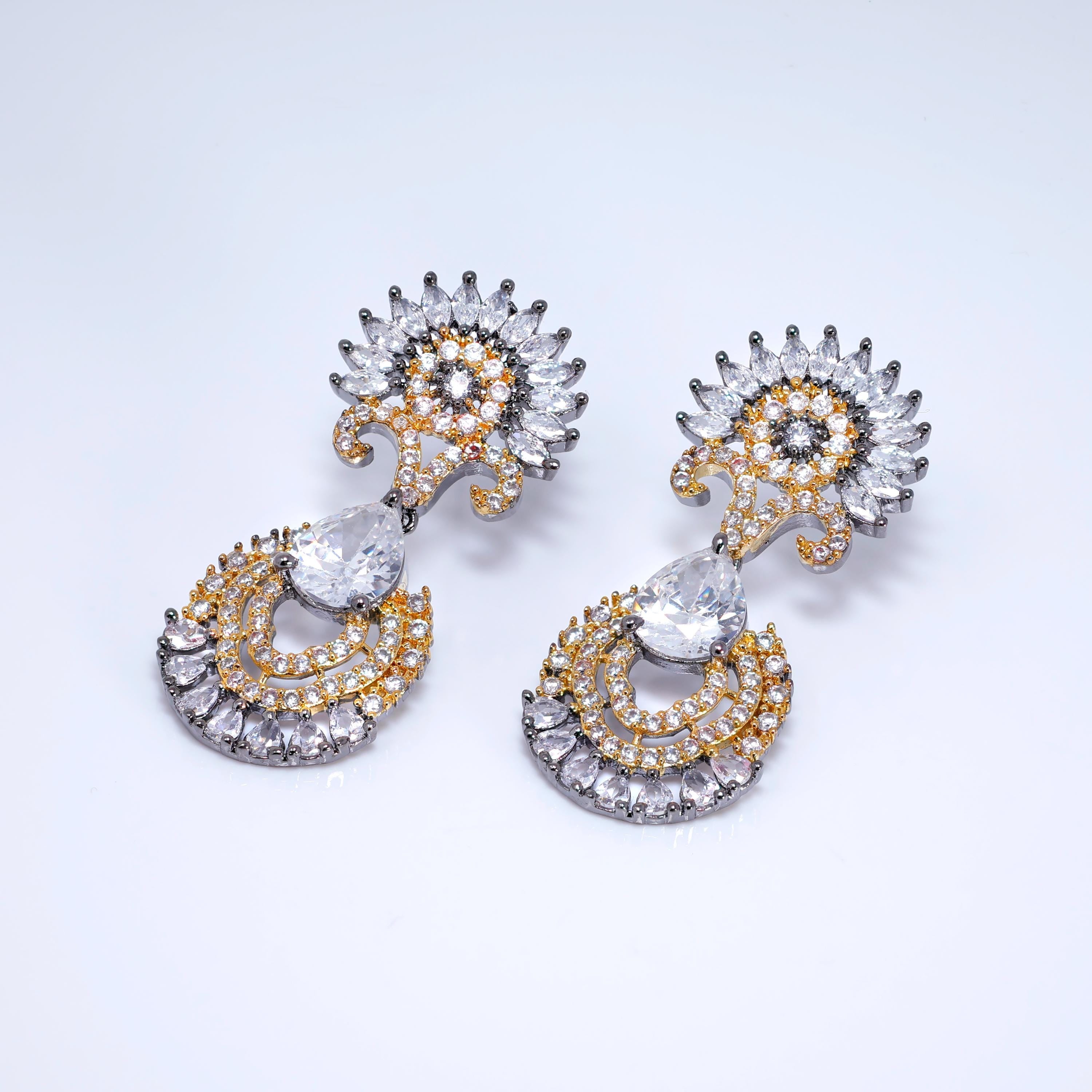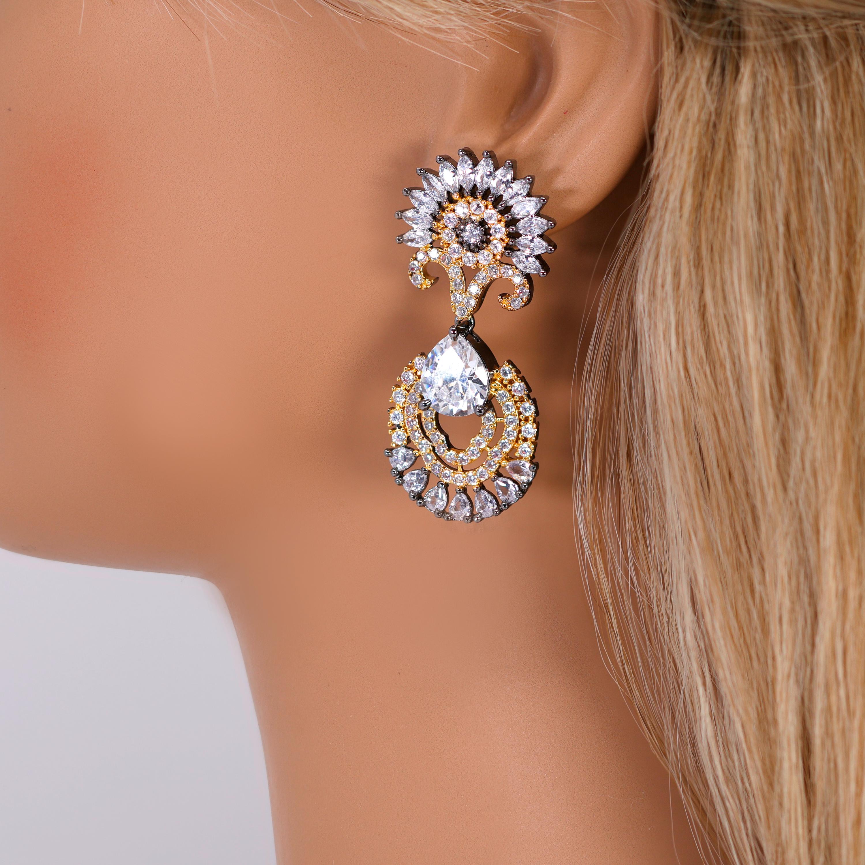 These Beautiful Romantic Black Gold Sunrise Sonata Earrings are crafted with the finest quality of Cubic Zirconia Diamonds, known for their exceptional brilliance and sparkle. These earrings are designed to add a touch of elegance and glamour to any look, and the intricate design and radiant shine make them truly special.