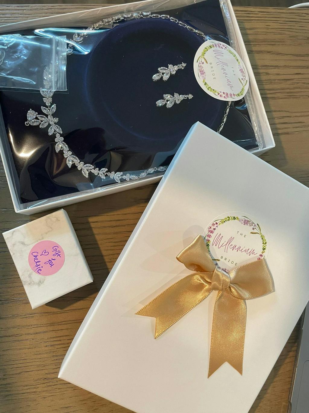 • • Each item is 100% gift-ready, and every order comes with a personalized handwritten card and a branded Millennium Bride jewelry cloth.