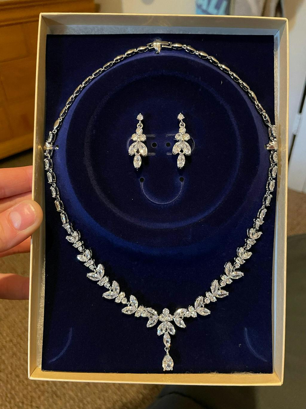The bridal set I ordered for my daughter is absolutely beautiful and there was also a gift in there for me which I thought was lovely thank you it was package really nice and delivery was really fast considering I'm in the uk I would definitely use again and 100% recommend I cannot wait to give this to my daughter a beautiful finishing touch for her and her dress thank you so much x