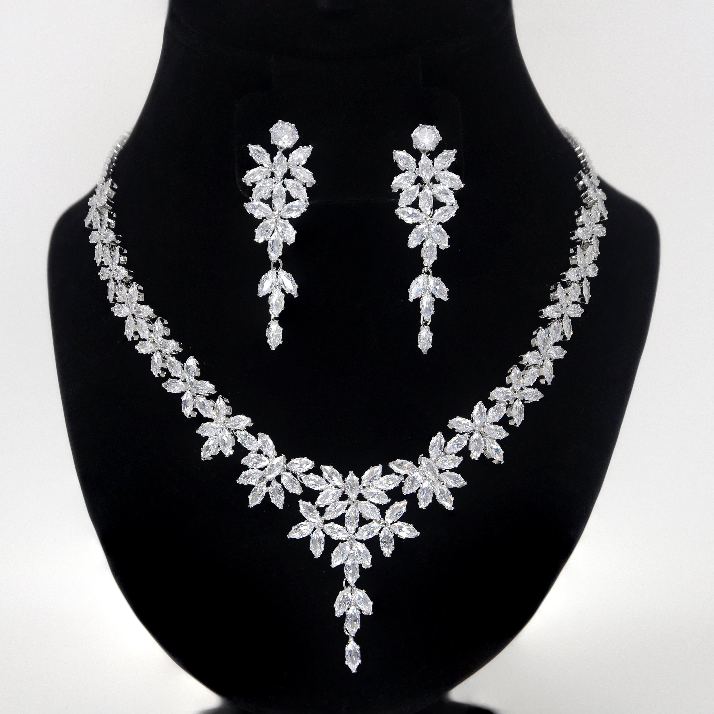 Diamond/ Swarovski Crystal Elegant Floral Vine Drop Necklace Set, Long Bridal Jewelry Set, Crystal Bridal Earrings, Statement Earrings