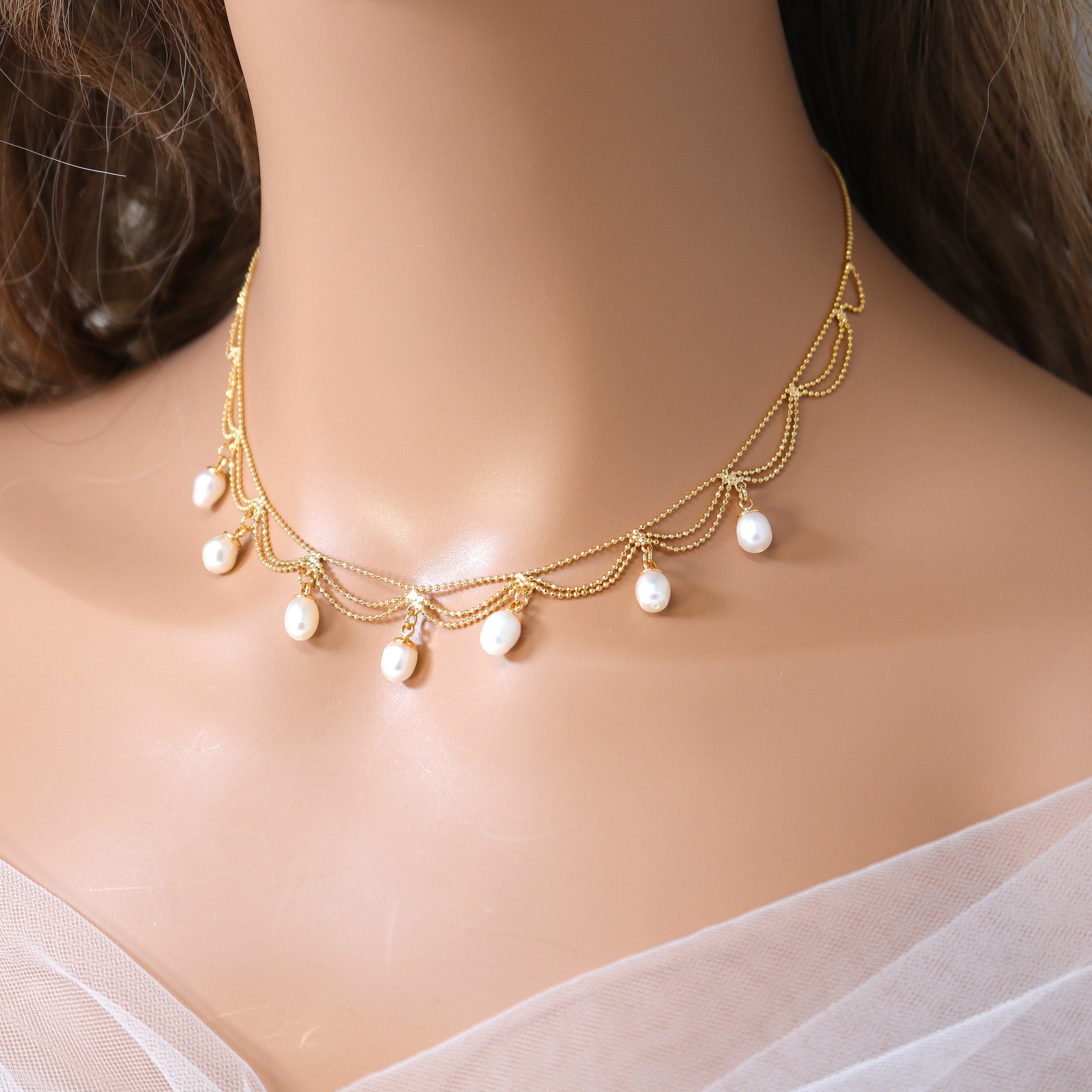 Freshwater Natural Pearl Drop Dainty Necklace, Bridal Chocker Necklace, Statement Earrings Cz