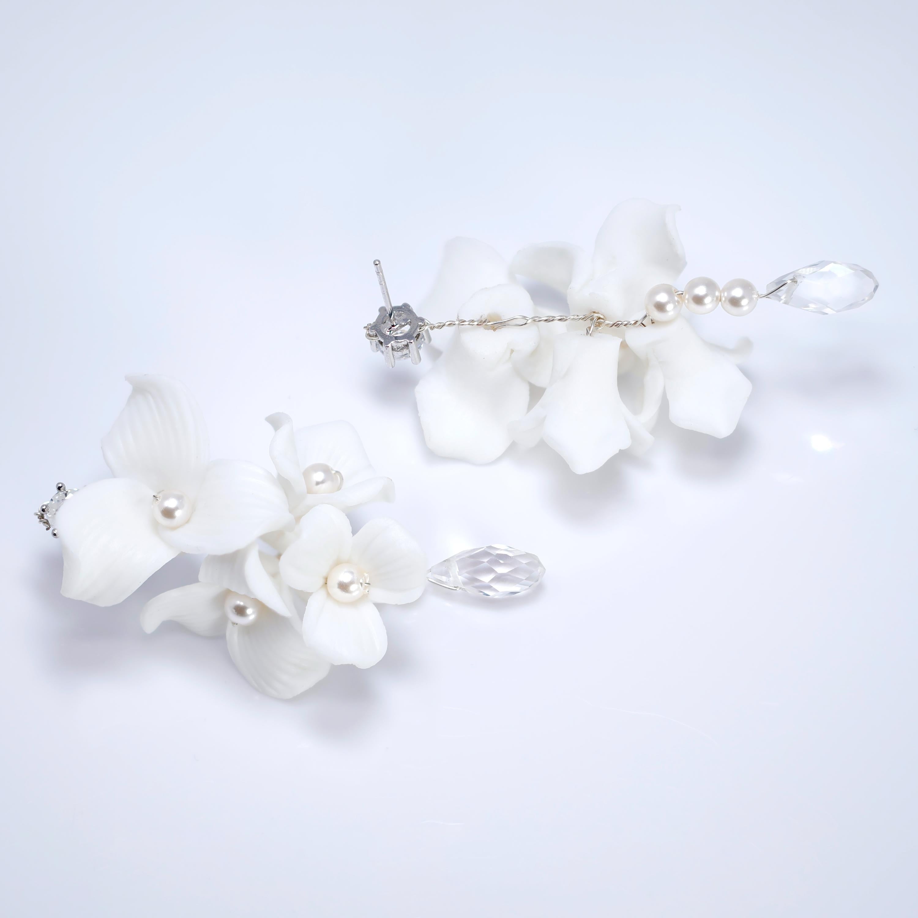 This beautiful Pearl Dusted White Orchid Blossom Earring handmade with fine quality of Faux Pearls, cubic Zirconia, rhinestone and beautifully made white Porcelain flowers for your special day.
