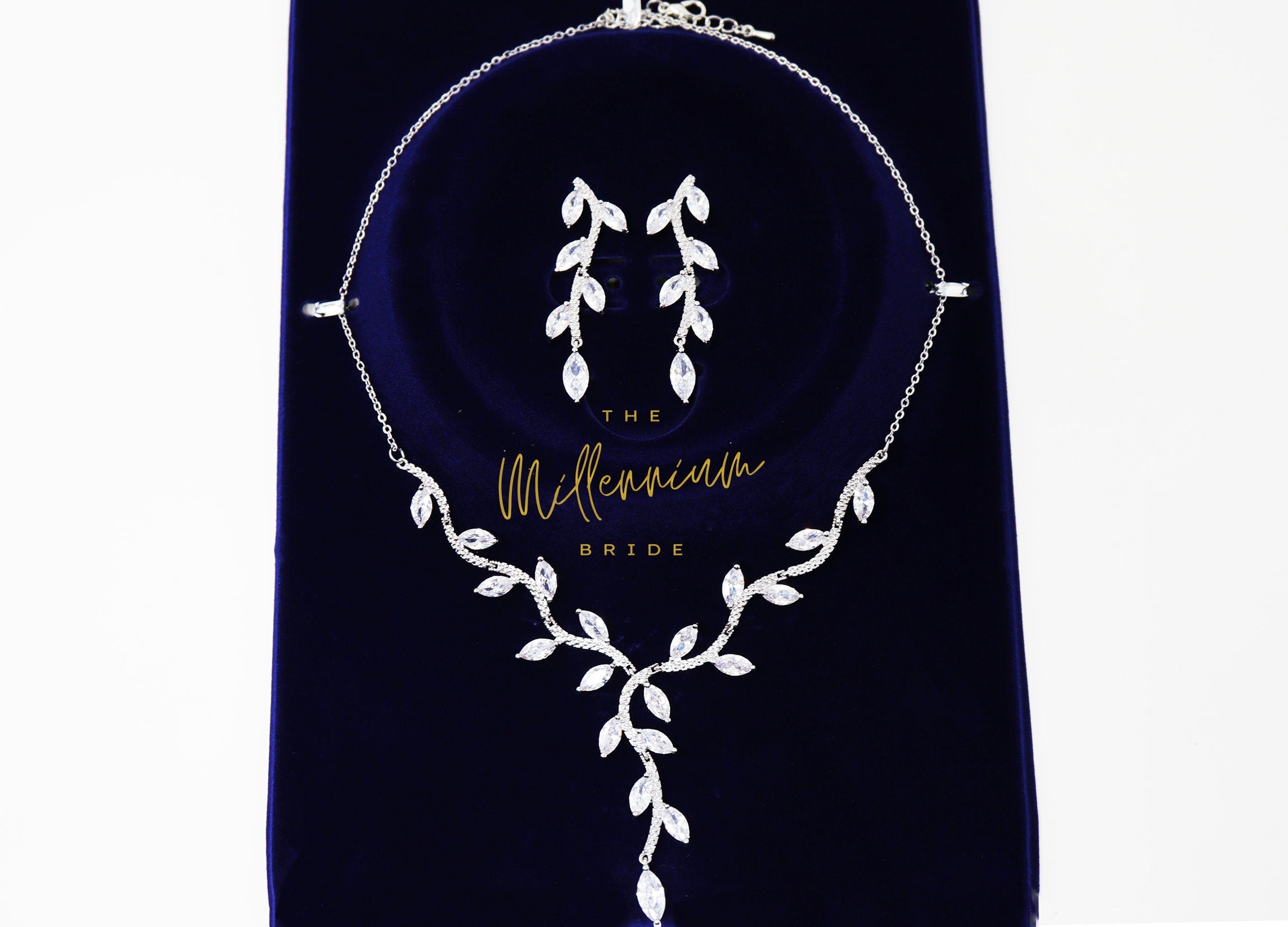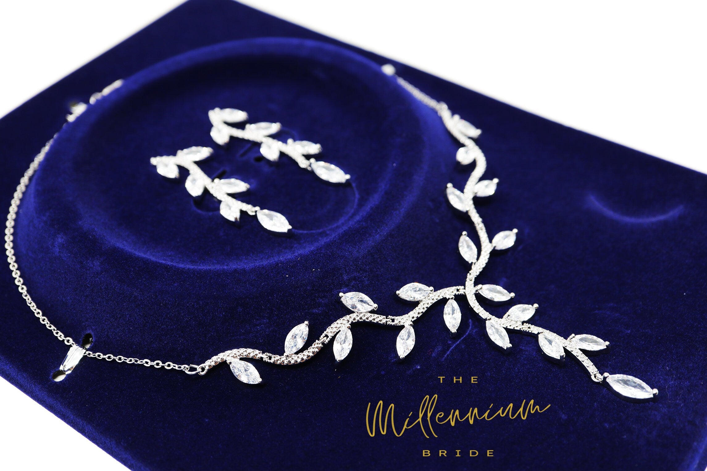These beautiful romantic DIAMOND VINE LEAVES bridal earrings and necklace set are made of very fine quality of Swarovski crystals/ Cz diamonds and plated with platinum for your special day!