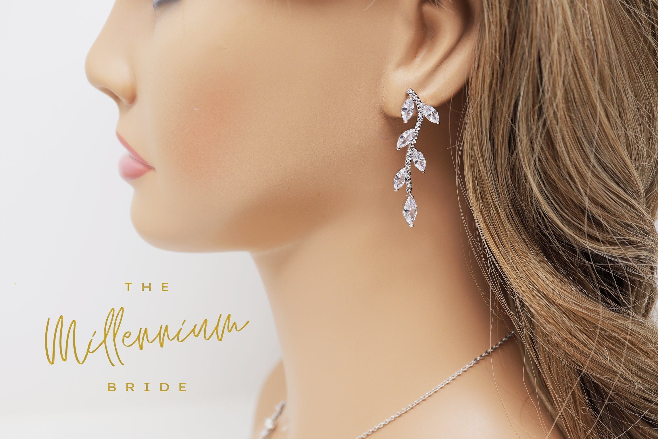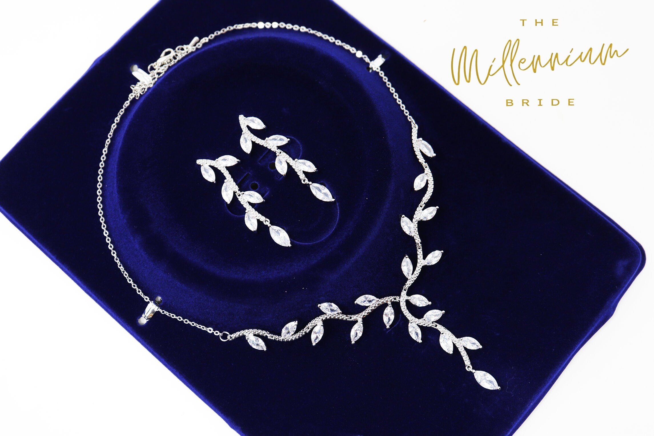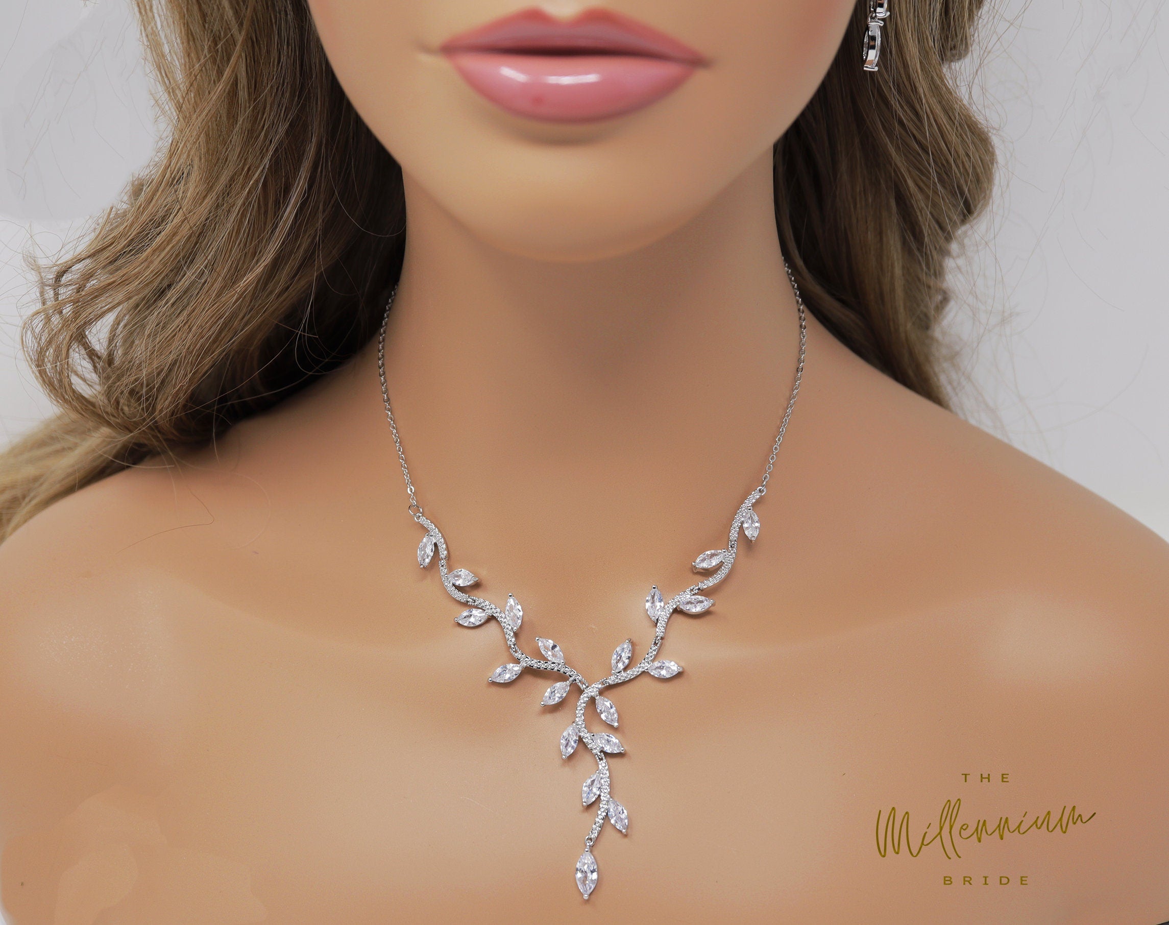 Swarovski Crystal Vine Leaves Necklace, Long Bridal Jewelry, Bridal Earrings And Necklace, Statement Earrings Cz Necklace Set.