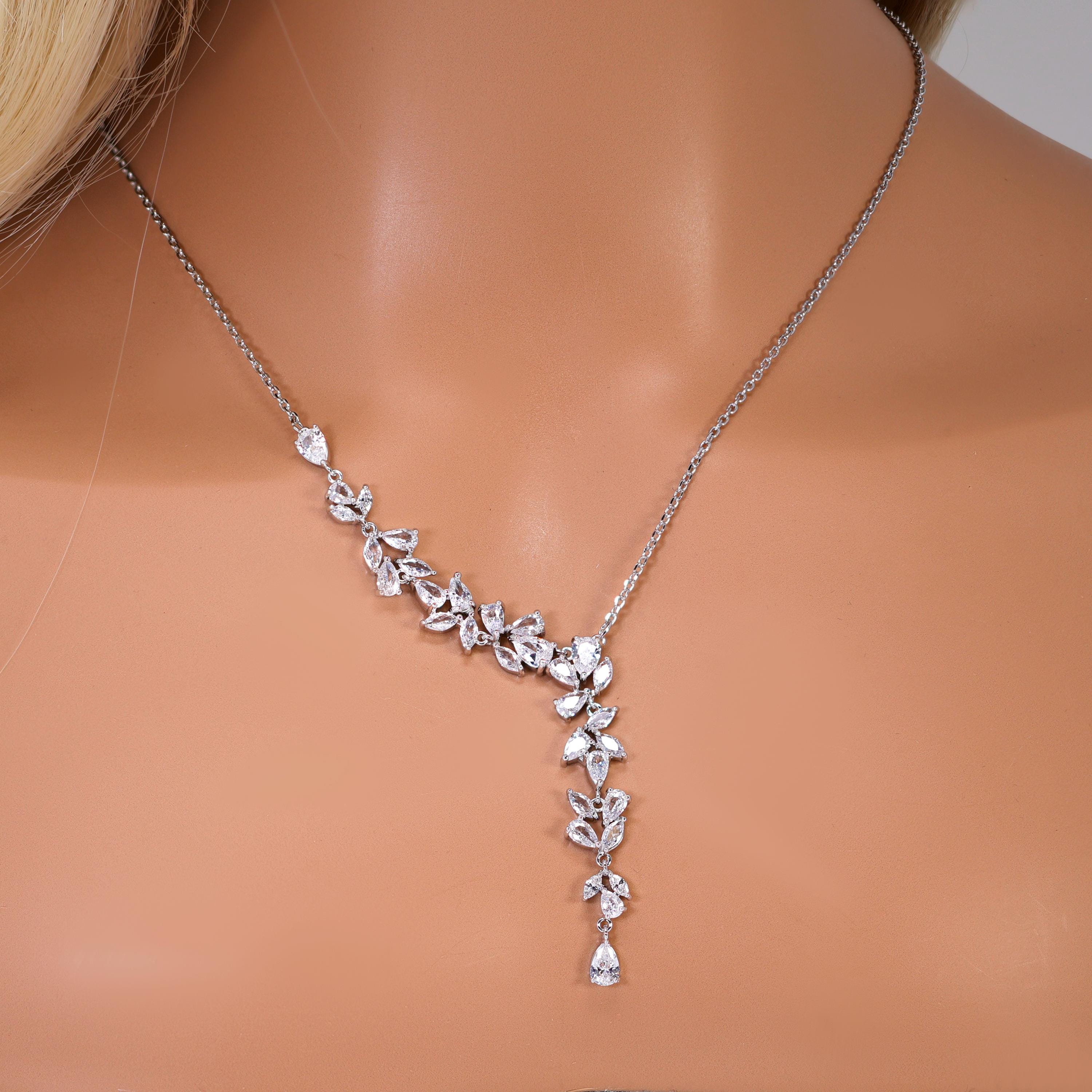Asymmetrical Floral Leaves Vine Drop Necklace Set, Long Bridal Jewelry, Bridal Earrings And Necklace, Crystal Bridal , Statement Earrings