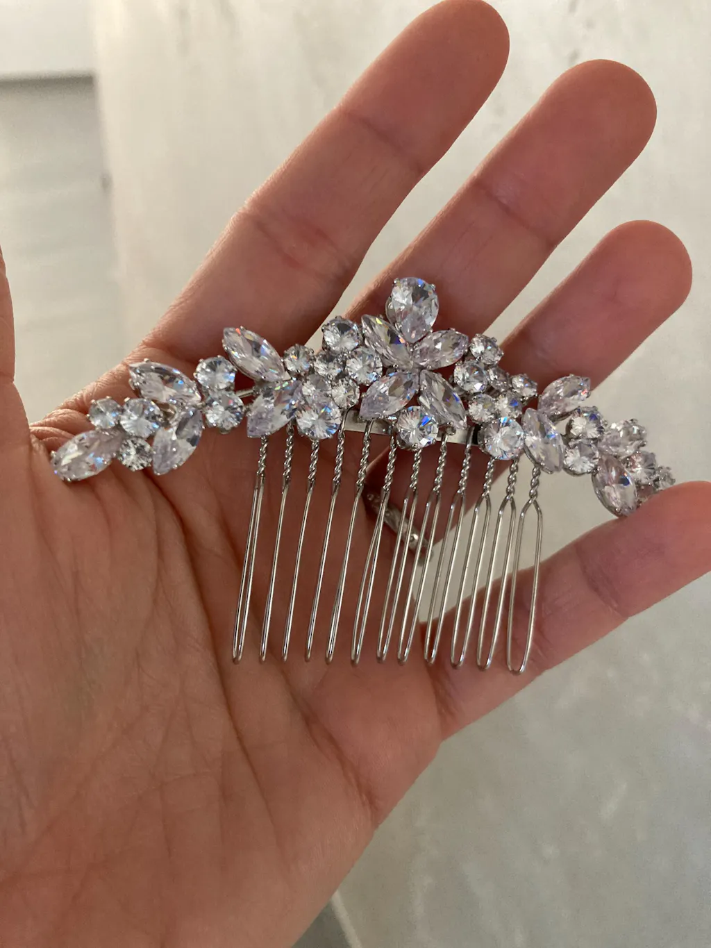 Add some glamour to your hairstyle with this beautiful Cubic zirconia/Diamond bridal hair comb available in silver finish. Whether tucked into an updo, paired with a veil, or loosely holding back part of your hair this hair accessory works for every look.