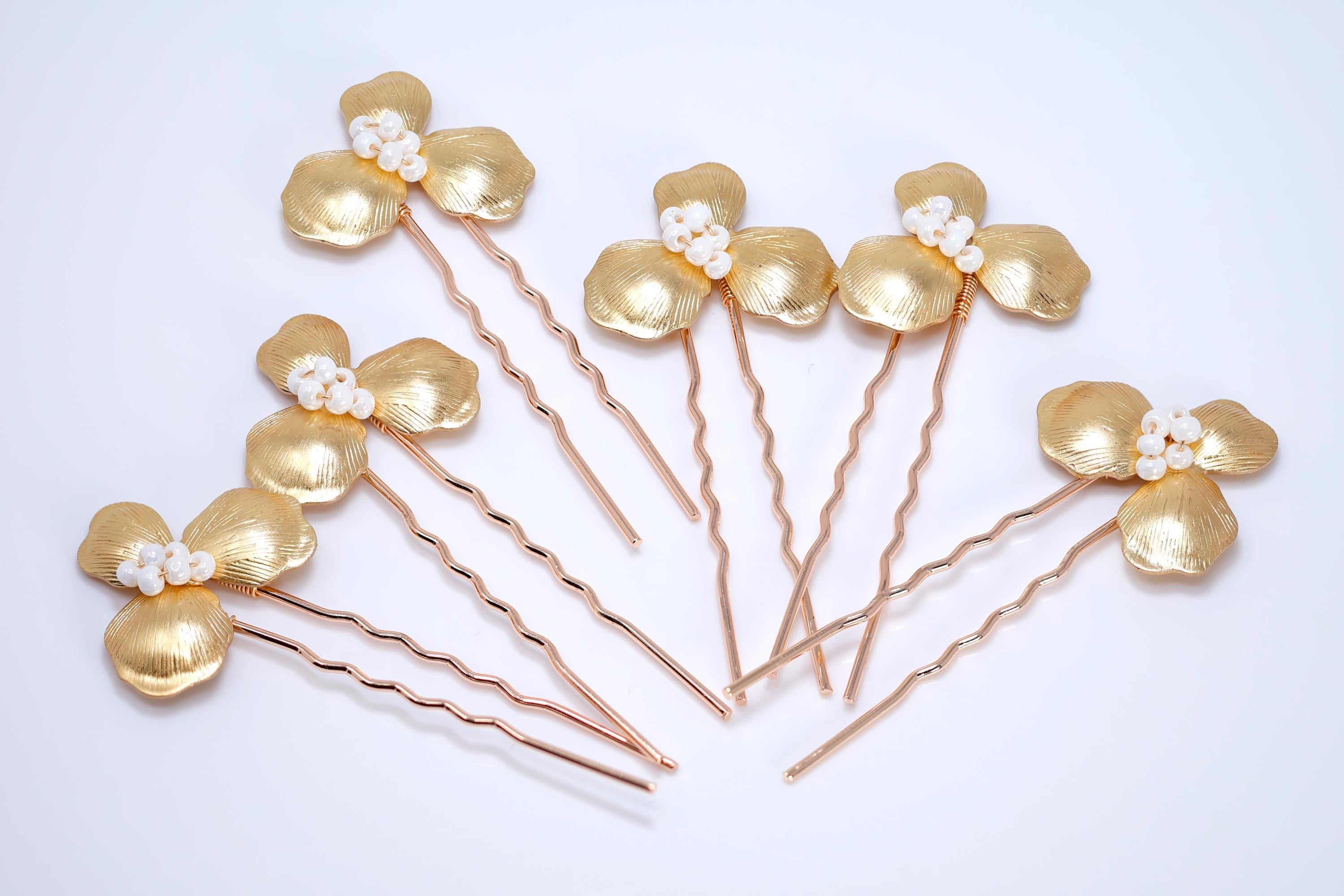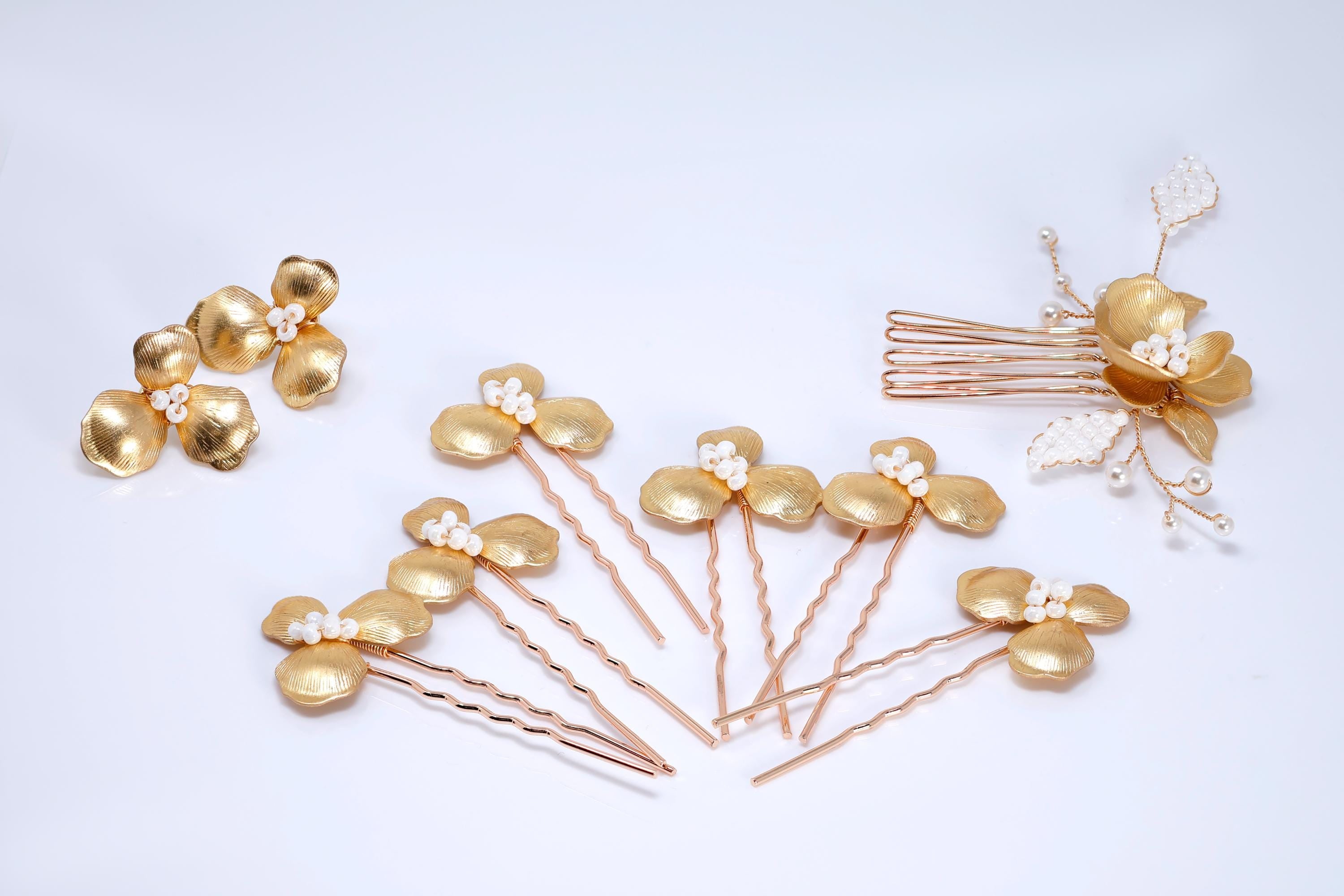 Golden Dreams With Pearl Dust: Earring, Comb And Hair Pins (Set of 6) Wedding Hair Accessory