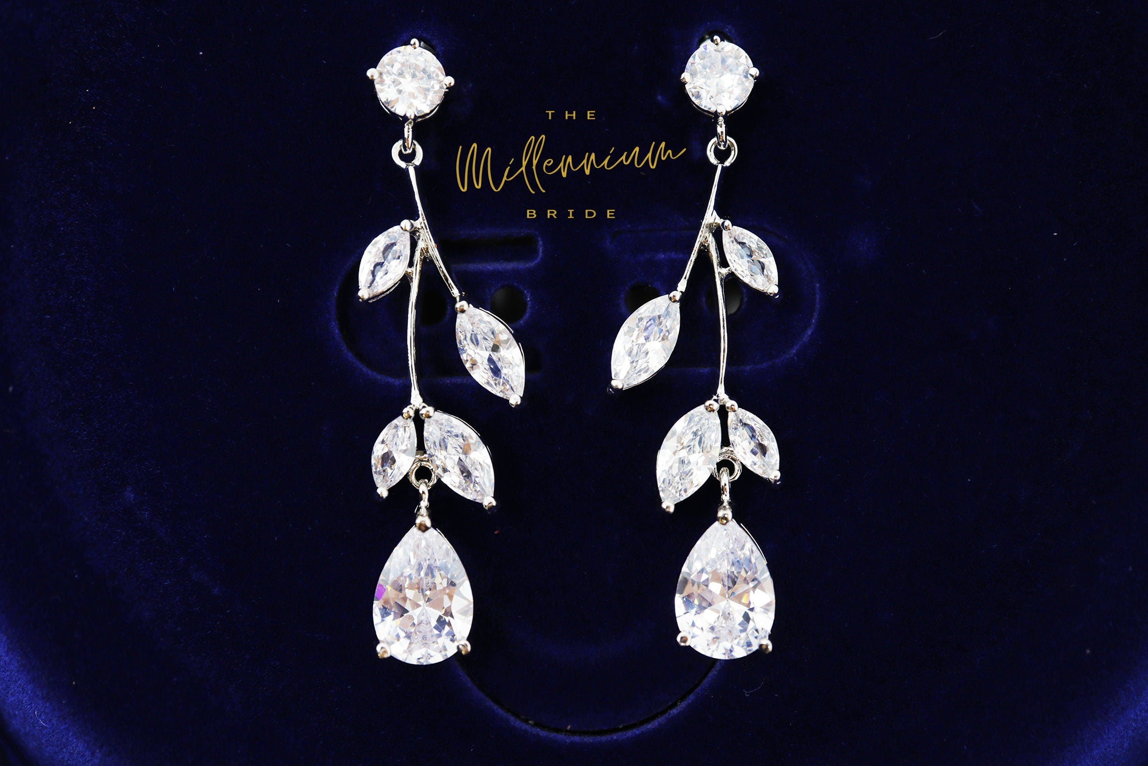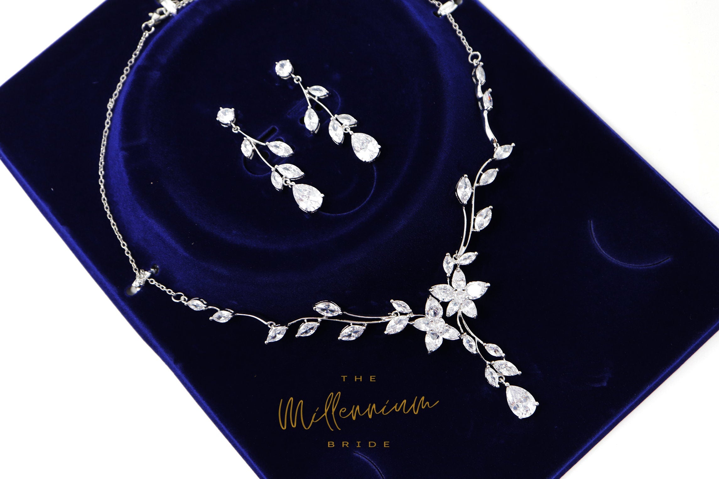 Swarovski Crystal Flower Vine Leaves Necklace, Long Bridal Jewelry, Bridal Earrings And Necklace, Statement Earrings Cz Necklace Set.