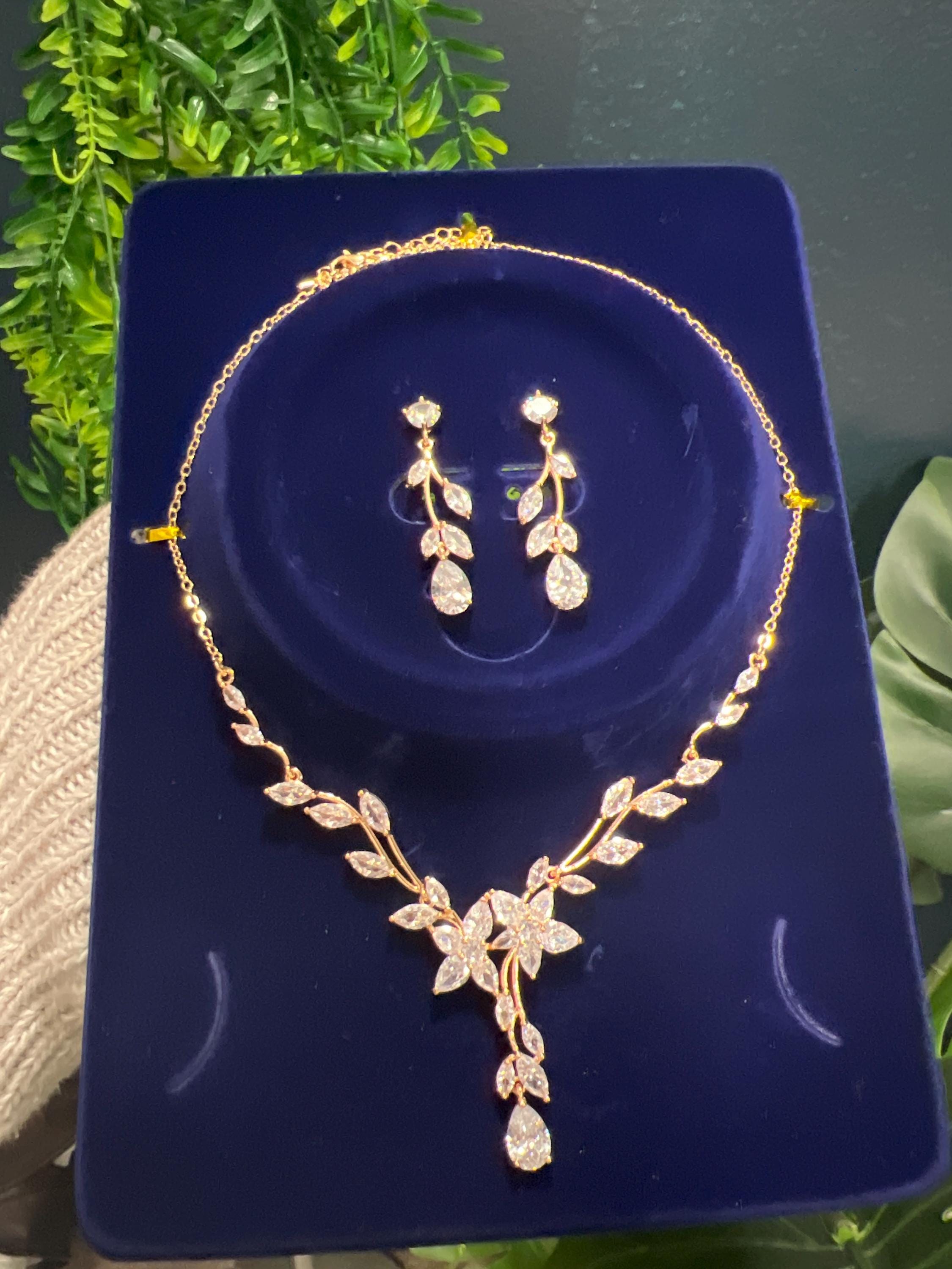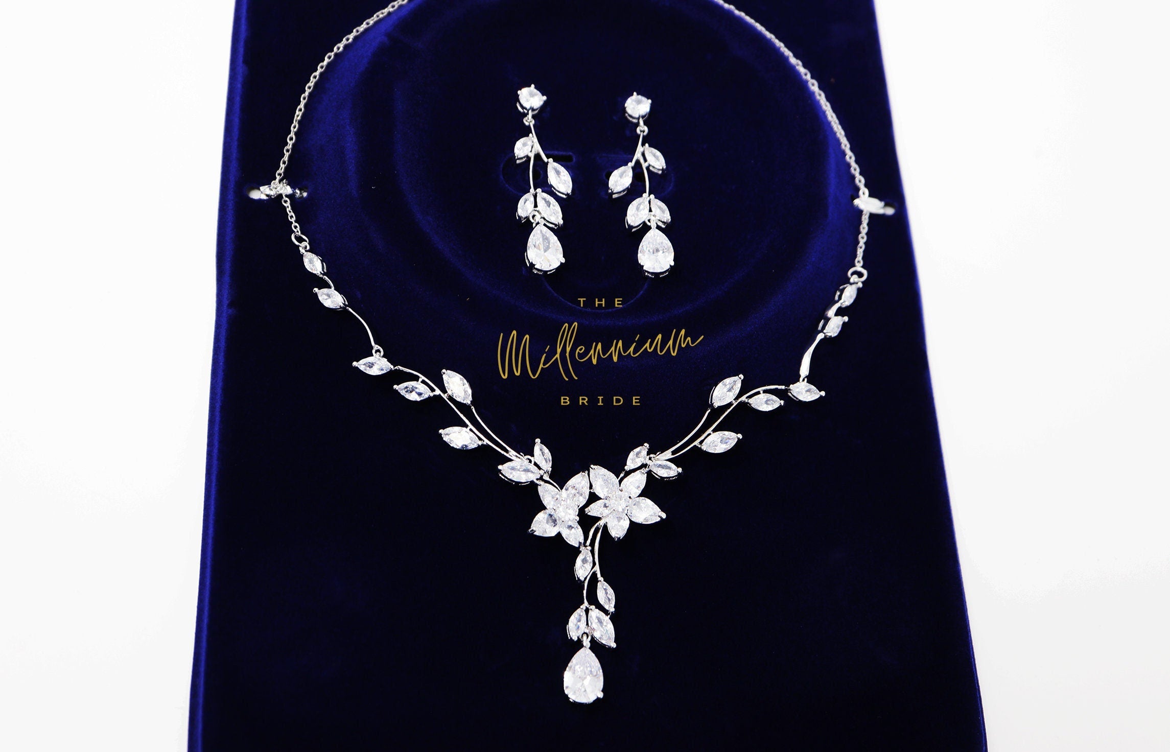 These beautiful romantic Diamond0 Flower VINE LEAVES bridal earrings and necklace set are made of very fine quality of Swarovski crystals/ Cz diamonds and plated with platinum for your special day!